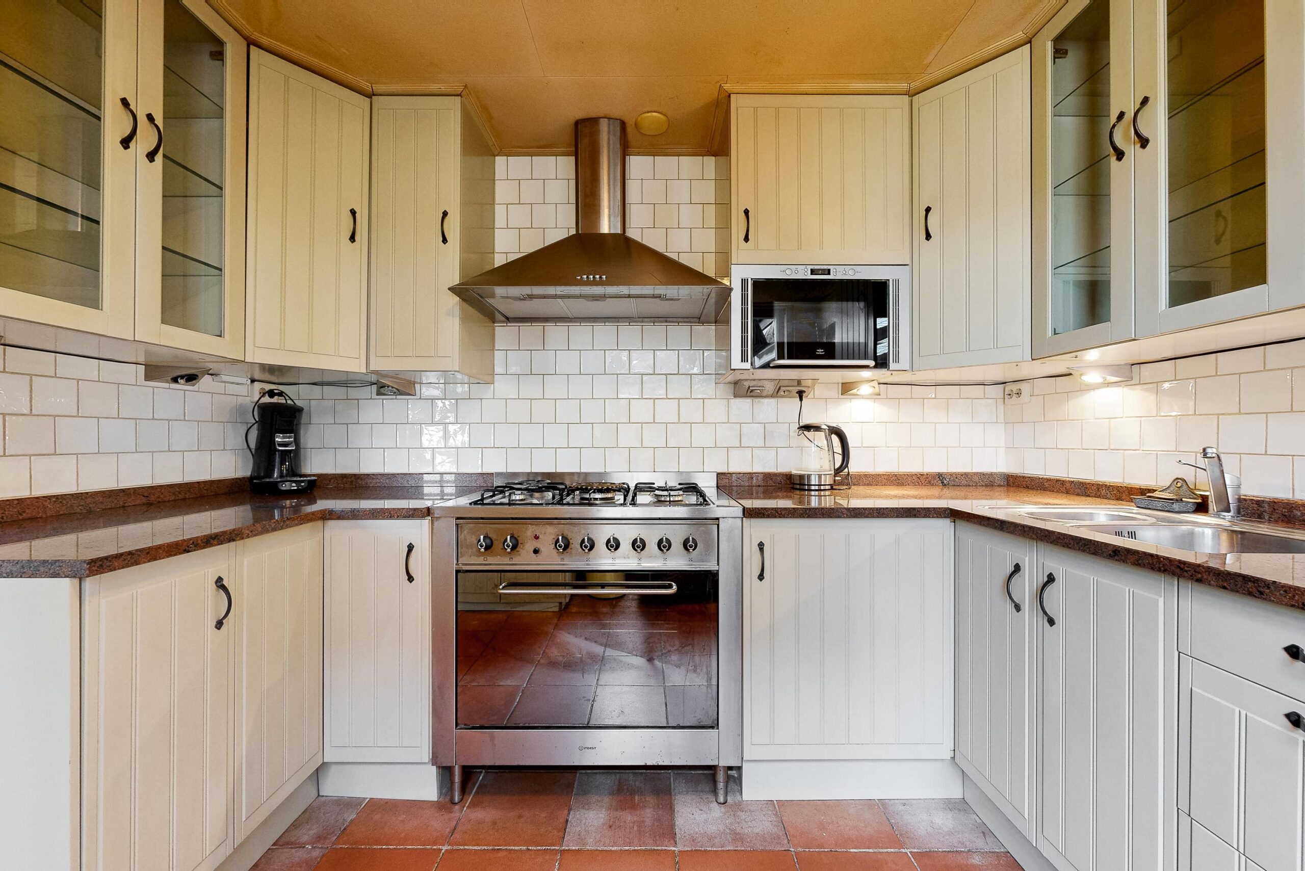 Via de hal met meterkast kom je in de lichte woonkamer met vloerverwarming, openslaande tuindeuren naar de achtertuin en prachtig vrij uitzicht aan de voorzijde. Keuken-en-suite is praktisch én sfeervol, voorzien van vloerverwarming, diverse inbouwapparatuur (afzuigkap, magnetron, koelkast, vriezer, gasfornuis) en een granieten aanrechtblad. Aansluitend vind je de bijkeuken met aansluitingen voor wasmachine en vaatwasser, ideaal voor extra gemak en opbergruimte en de badkamer met douche, ligbad, wastafel(meubel), designradiator en toilet.