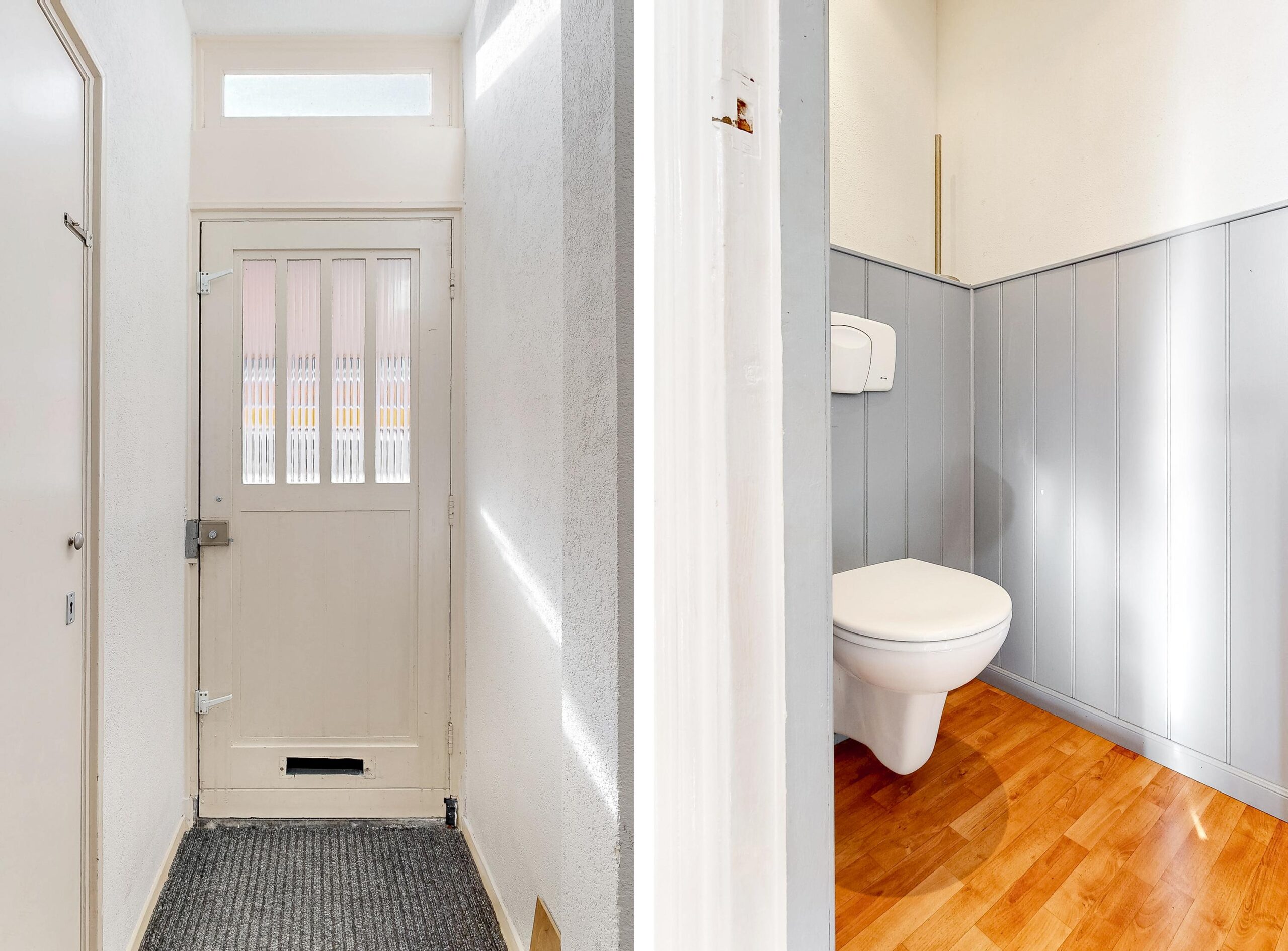 overloop, zwevend toilet met fonteintje, ruime, lichte woonkamer met laminaatvloer, vaste kast, deur