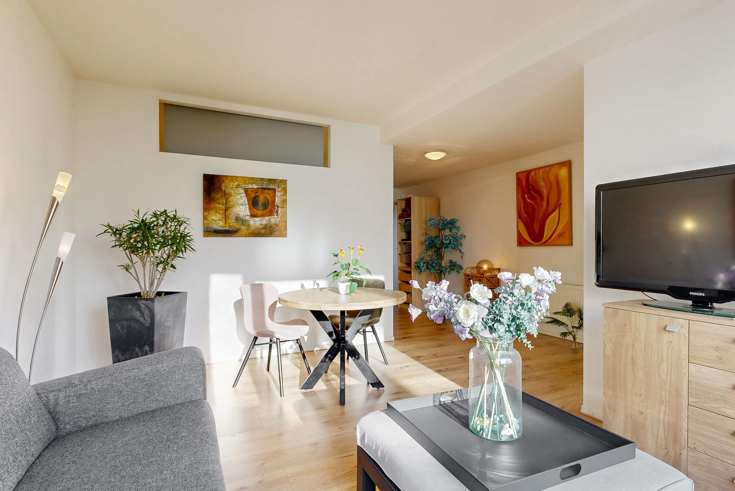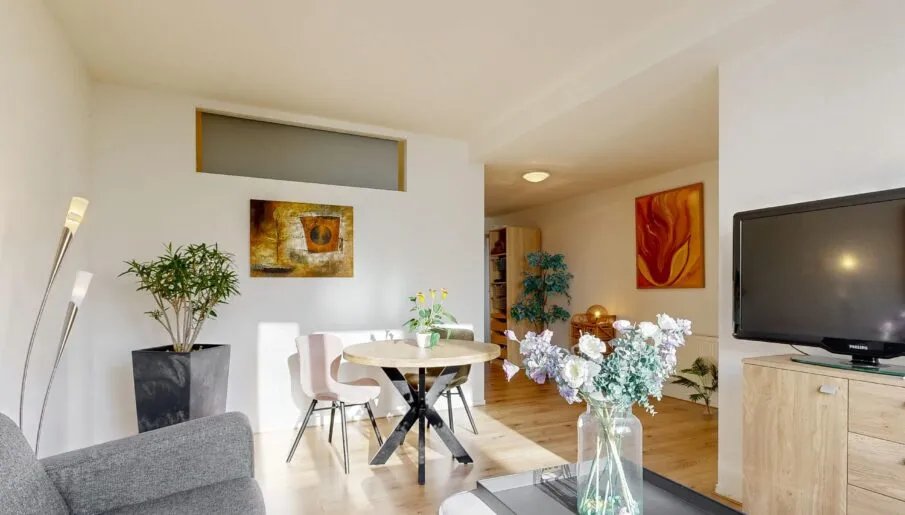 Dit appartement combineert comfort met licht en ruimte. De woonkamer is voorzien van een lichtkoepel, laminaatvloer en airconditioning/luchtwarmtepomp. De keuken is praktisch ingericht en beschikt over een aansluiting voor de wasmachine. De badkamer is uitgerust met douche en wastafelmeubel, en het moderne zwevende toilet met fonteintje biedt extra gemak. Op de eerste verdieping ligt een slaapkamer met dakkapel en airco/luchtwarmtepomp.