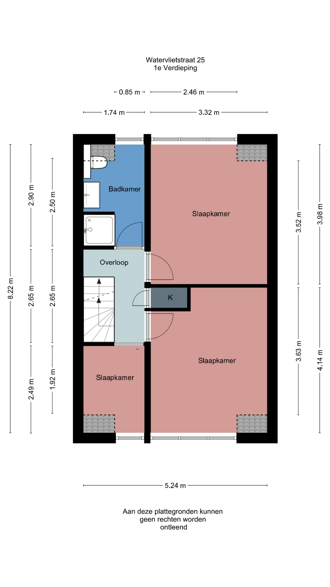 overloop, grote slaapkamer aan de voorzijde, kleine slaapkamer aan de voorzijde, grote slaapkamer aan de achterzijde, badkamer met douche, wastafel, toilet.
