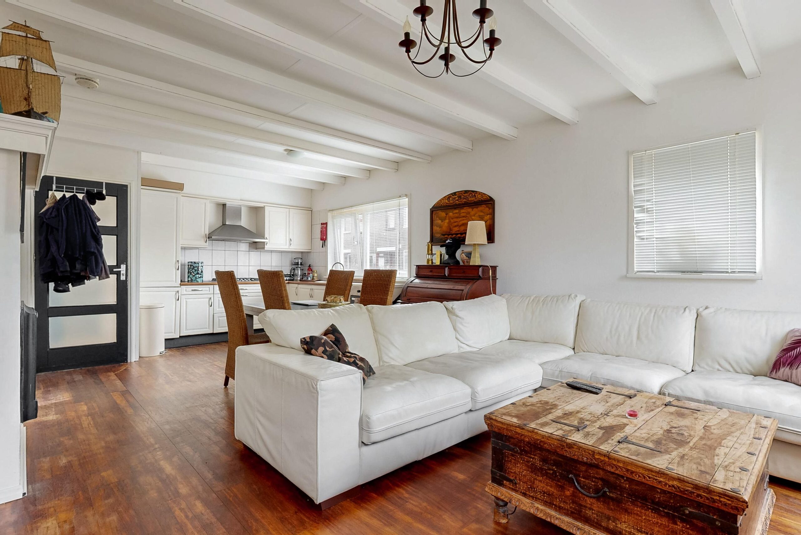 De woning (voorzien van kunststof kozijnen) beschikt over een woonkamer met een houten balken plafond, een hardhouten vloer, veel lichtinval en een open keuken. Tevens op de begane grond een slaapkamer en een nette badkamer. Op de eerste verdieping zijn er twee ruime slaapkamers en een 2e badkamer. De woning heeft een groot dakterras op de eerste verdieping. Op de zolderverdieping zijn nog eens twee ruime slaapkamers, voorzien is van een dakkapel.
